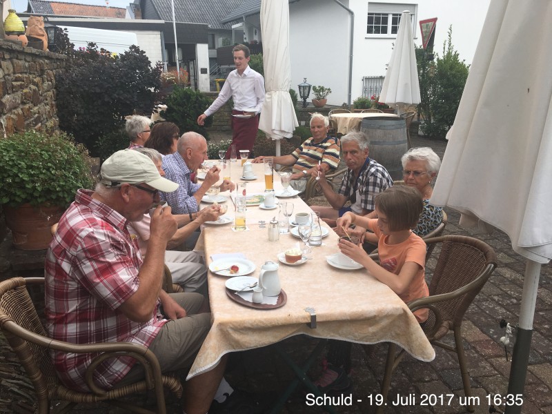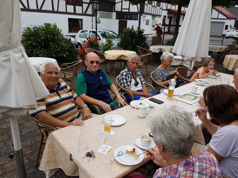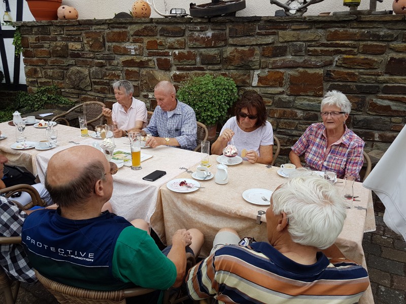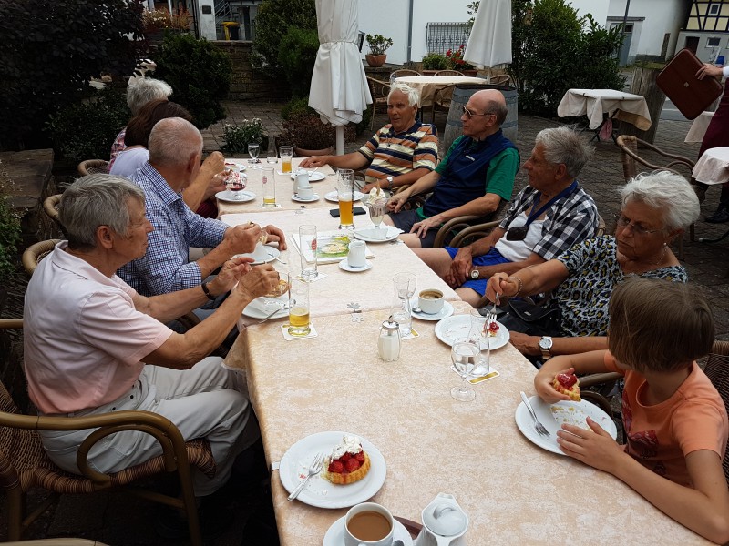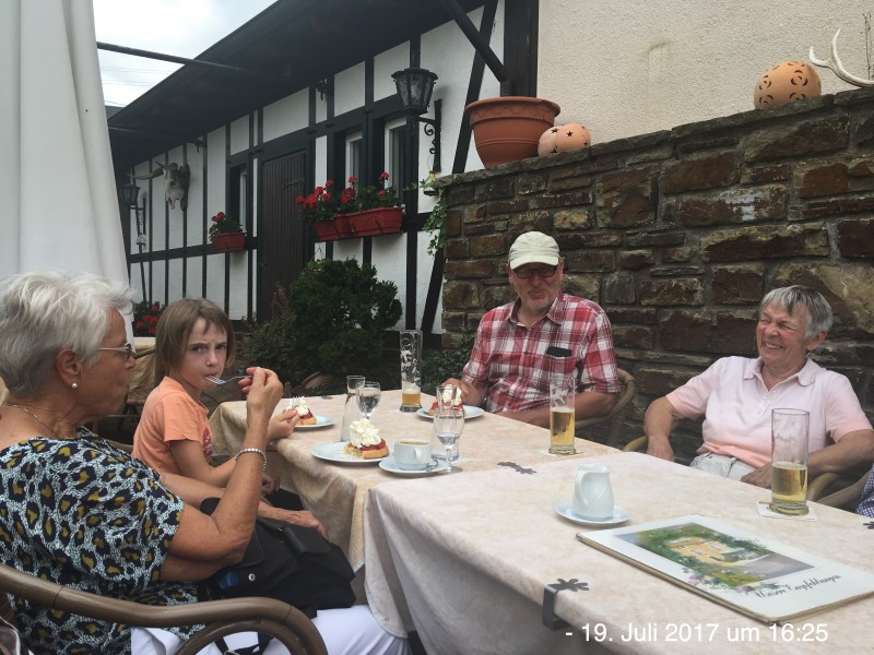 Abschluss draußen bei kühlenden Getränken, Kaffee, Törtchen und Eis im Landgasthaus Pfahl in Wershofen.