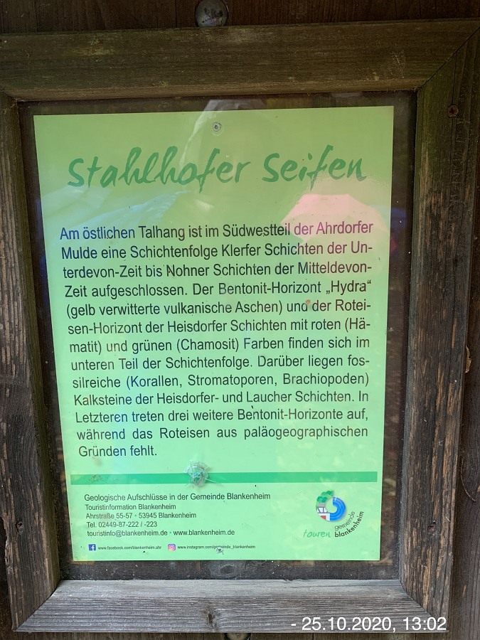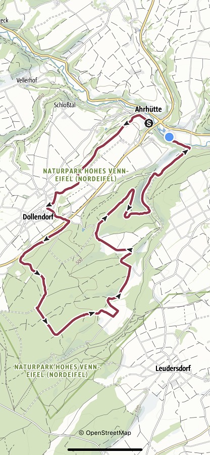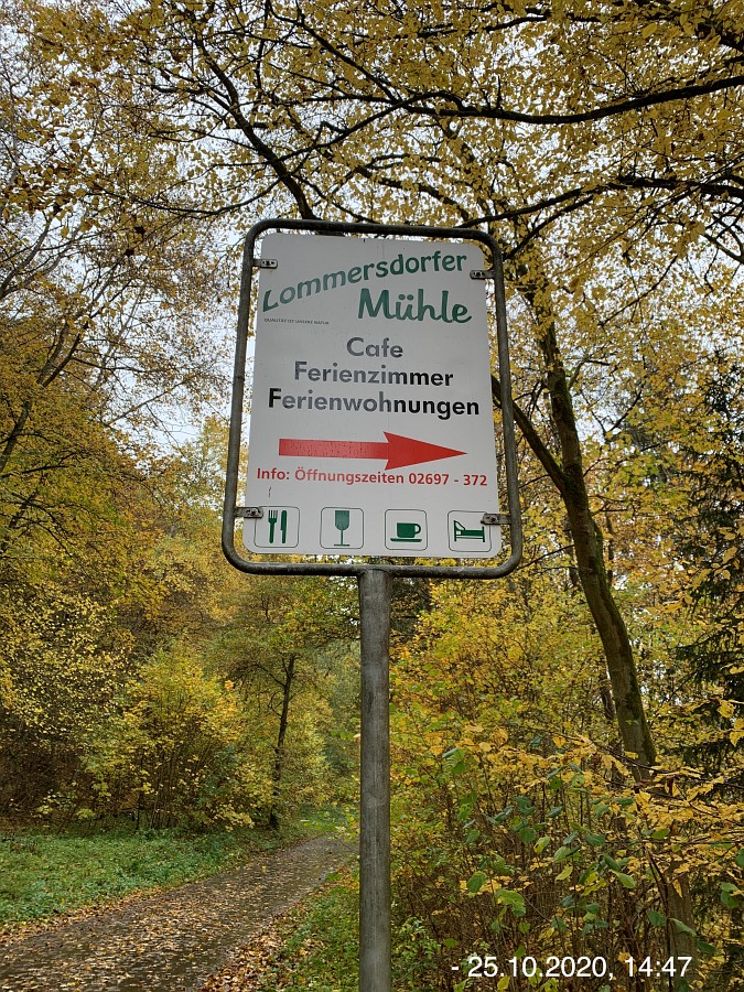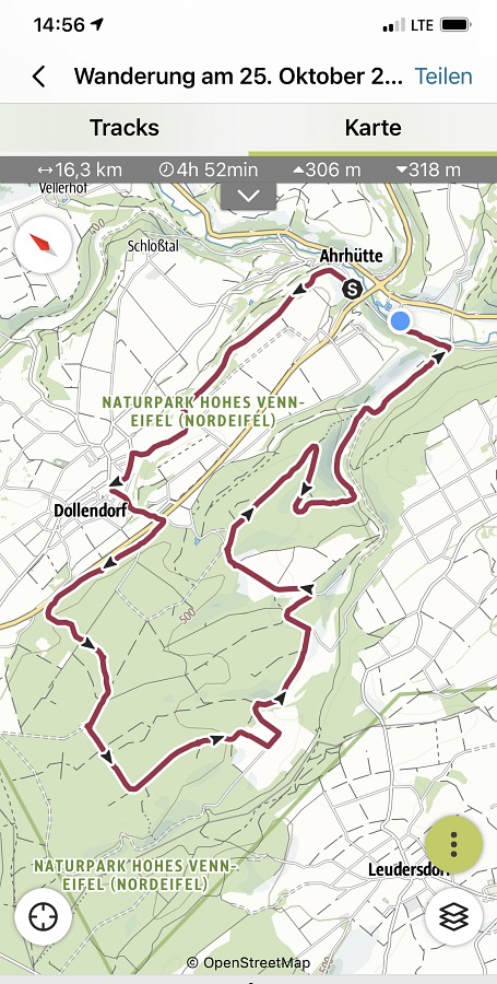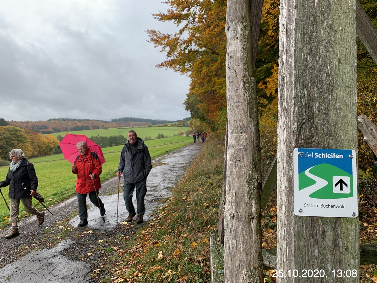 Startpunkt war diesmal der Wanderparkplatz unter der Brücke B258/L115 neben dem Friedhof in Ahrhütte, von wo aus wir auch unsere Wanderung starteten. Der offizielle Startpunkt laut der Wanderbroschüre ist an der Ahr-Grundschule in Dollendorf. Wir wanderten auch nicht zuerst in nord-östlicher Richtung Unterbusch, sondern in süd-westlicher Richtung Dollendorf und Oberbusch. Durch diese Änderung kann man eine ziemlich lange Steigung auf der Strecke vermeiden. Aber egal von wo aus man startet, die Wanderstrecke ist so gut beschildert, dass man auch ohne Karte immer zum Ziel kommt, ganz gleich in welche Richtung man geht. Da dieser Wanderweg bereits mehrfach im Netz beschrieben ist, möchte ich nur noch einige zusätzliche Bemerkungen machen. Angenehmes Wanderwetter, ab und zu etwas leichter Regen konnte uns nicht unsere gute Laune nehmen. Natur jetzt vollkommen herbstlich, Wiesen grün, Bäume und Sträucher in vielen bunten Farben; da braucht man nicht zum Indian Summer nach Kanada zu fahren, momentan wohl auch nicht sinnvoll. Viele Weitsichen, Antoniuskapelle, Schloßtal, Lommersdorf, Freilingen; später auch wieder Aremberg, Hohe Acht und die Nürburg. Große Pause an einer Bank auf dem Roterberg, Nähe Sur. Auf dieser bisherigen Teilstrecke geht der Naturweg eine Weile an der L115 vorbei, da wird man manchmal schon etwas von Auto-Lärm und im Sommer von brüllenden Motorrädern gestört, aber man kann nicht alles haben. (besonders die Motorräder sind ja eine Sache der Exekutive) Danach aber wirklich nur noch Waldgeräusche. Nach der verdienten Stärkung vorbei am Fliegerkreuz (Uffz Börge Darr), Stahlhof, Stahlhofer Seifen, Erschfelder Seifen und Pflanzenhäuschen. Zum Ende hin noch entlang dem Michelsbach, Michelsberg und der Ahr. Gemütlicher Abschluss in der Lommersdorfer Mühle.