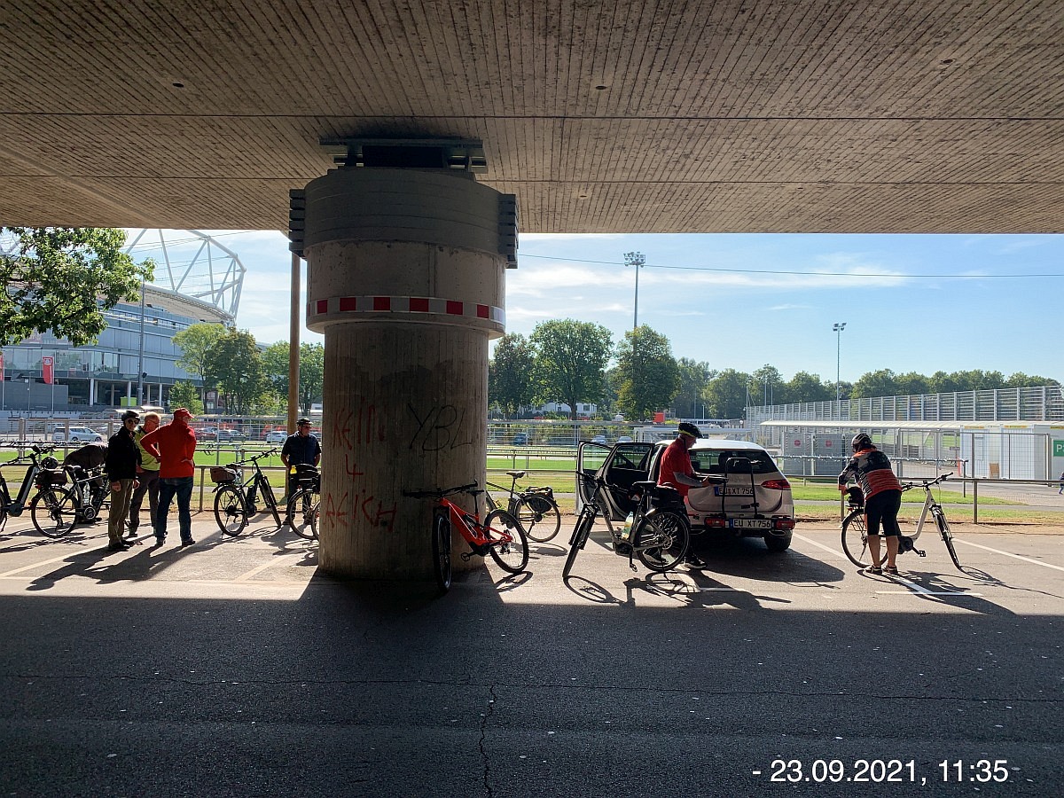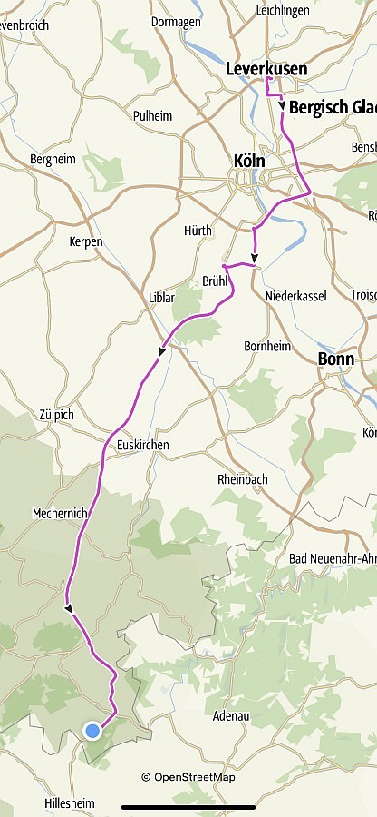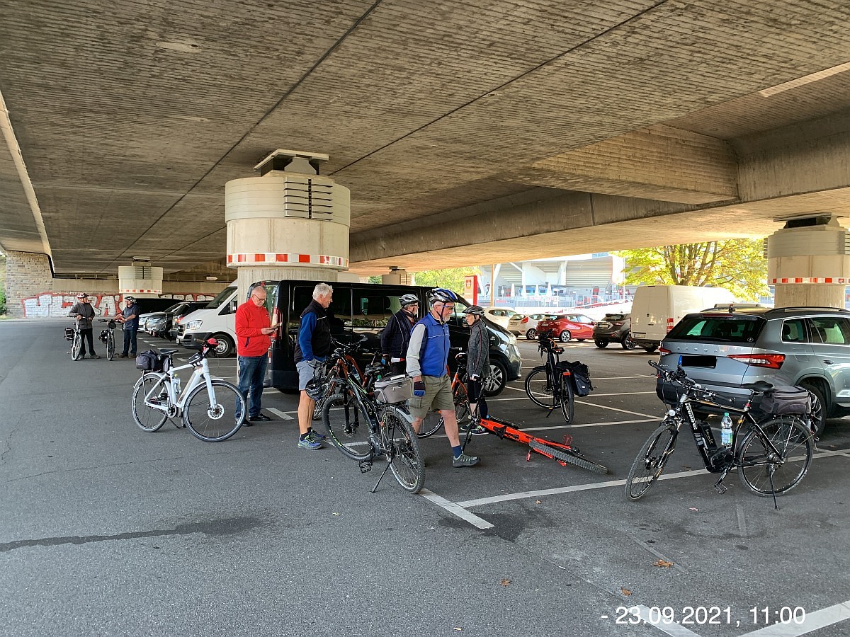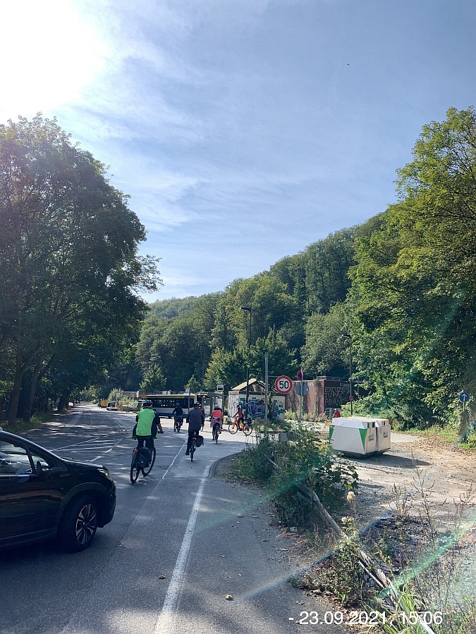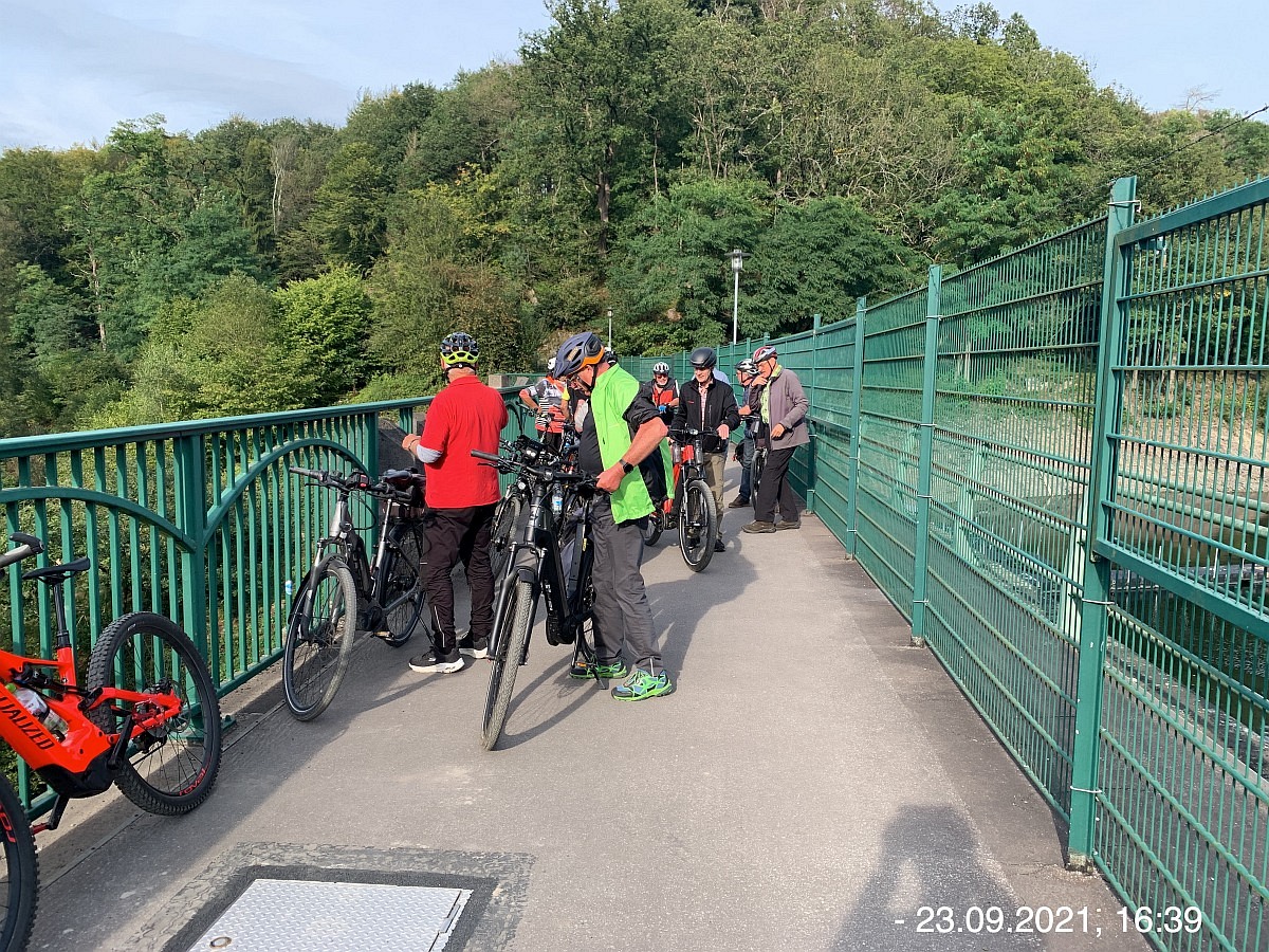 Nach der langen Anfahrt und zusätzlicher halbstündiger Verzögerung ging's in Leverkusen von der BayArena aus los auf unsere ausgedehnte Tour. Da Rudolf so nett war, und uns seine Planungs-Unterlagen gegeben hat, werde ich diese hier einarbeiten - Planung - Anfahrpunkte - Müngstener Brücke - und nur noch einige zusätzliche Stichpunkte nennen. Im letzten Bild der Bildergalerie kann man den Streckenverlauf gut nachvollziehen. Das Wetter war einfach toll. Im Bergischen Land ein ewiges Auf und Ab, ohne eBikes wäre das schwer zu bewäligen gewesen. Alle kamen gut zurecht. Radwege zumeist in gutem Zustand. Teilweise vom Unwetter leicht beschädigt. Man konnte auch sehen, dass die Wupper über die Ufer getreten war, und Verwüstungen angerichtet hatte. Auch das Waldsterben ließ sich erahnen, da abgestorbene und dürre Nadelbäume und auch viele gefällte Baumstämme zu sehen waren.