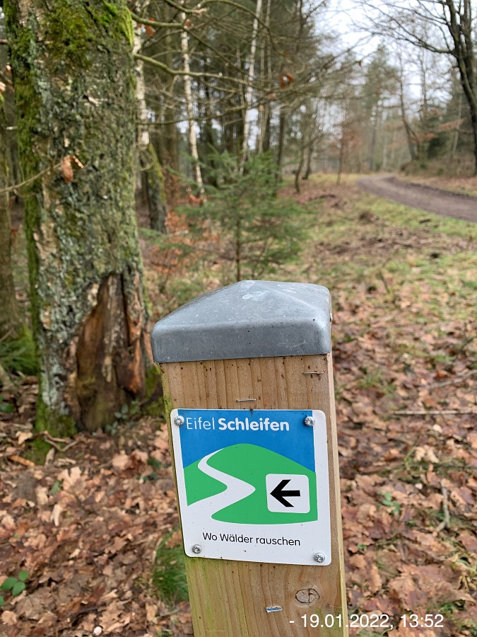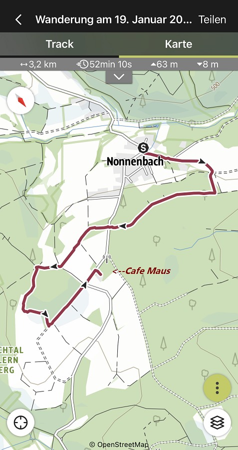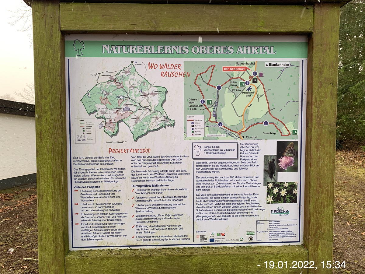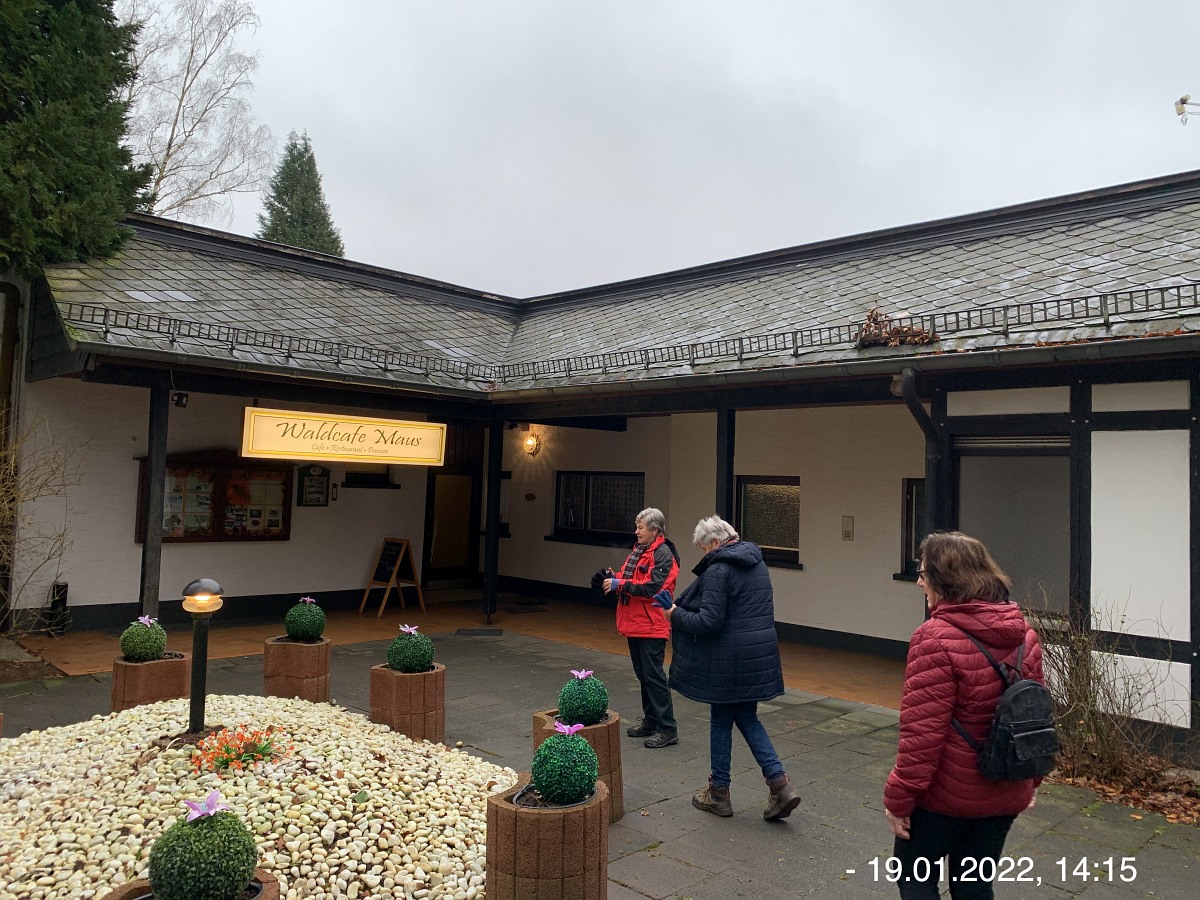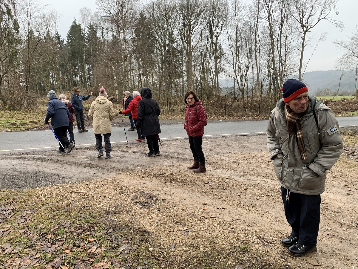 Kommando zurück; Treffpunkt Wanderungen weiterhin Parkplatz unterhalb der Weiherhalle. Parkpatz an der Lühbergstraße immer noch Baustelle und gesperrt. Irgendwas klappt da wohl nicht. Heute zuerst mit den Autos zu unserem Startpunkt nach Nonnenbach am uns wohlbekannten  Pferdestall. Von dort aus in südlicher Richtung auf unsere Strecke. Kein Super-Wetter, aber alle waren der Jahreszeit entsprechend gekleidet und so war es ok. Wanderwege nass und teilweise sehr verfahren und pfützig. Zwischen Cafe Maus und Nonnenbach überquerten wir die Landstraße wo wir auf einer Tour am  09.02.2020  einen gefährlichen Sturm er(über)lebten. Weitere beschädigte Fichten wurden vor kurzem noch abgeholzt. Wir tangierten die EifelSchleife  "Wo Wälder rauschen". Wiesen noch etwas grau, viele  Maulwurfshügel (auch kleinere von Wühlmäusen),  bis zum Frühling dauert's noch etwas. Natur momentan etwas trist, aber die frische und gesunde Eifelluft entschädigte uns. Im Übrigen beeilten wir uns zum  Cafe Maus  zu unserem gemütlichen Abschluss zu kommen. Die Corona-Regeln wurden sehr ernst genommen und wir mussten Zertifikate und Perso vorzeigen. Alle cooperierten.  Auf unserem Rückmarsch zu den Autos kam dann doch noch etwas winterliche Stimmung auf, es schneite leicht. Eine gut gelungene erste Wanderung des Jahres 2022.