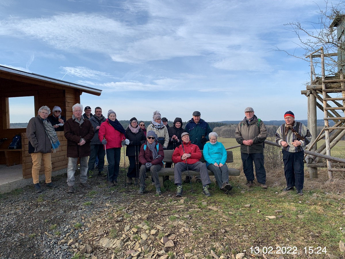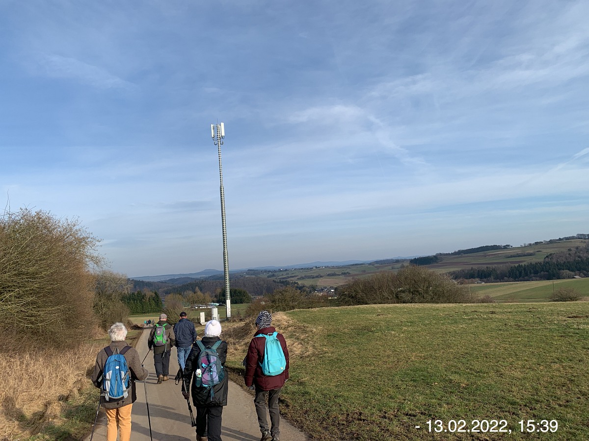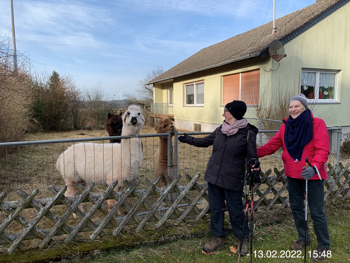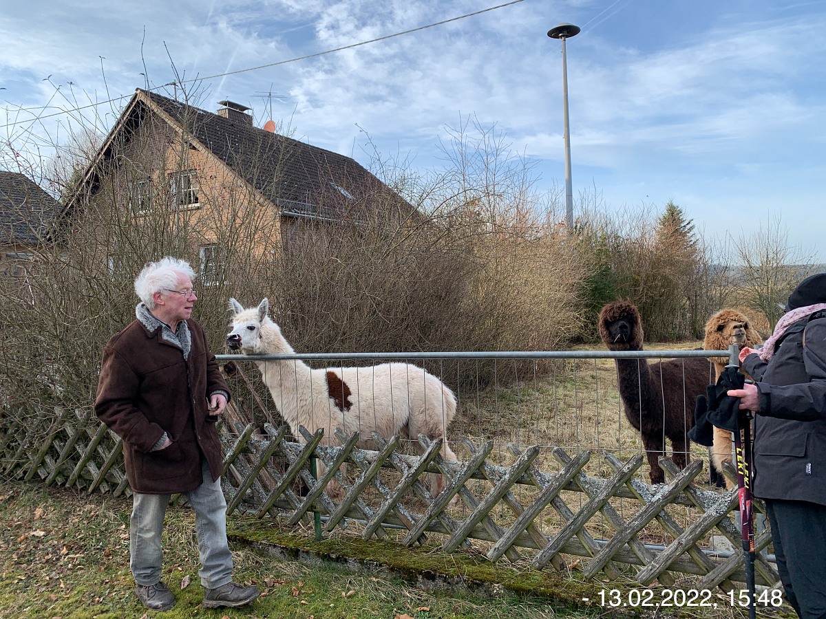 Mit den Autos vom Parkplatz P3 unterhalb der Weiherhalle über die Ahrstraße durch Ripsdorf nach Waldorf zum dortigen Bürgerhaus. Hier erwartete uns schon Robert mit weiteren Mitstreitern:innen. Sofort südlich auf unsere Wegstrecke Richtung Esch. Wetter gut, kühl, sogar etwas Sonnenschein. Auf der Höhe sehr windig. Also viel frische und gesunde EifelLuft. Wege der Jahreszeit entsprechend teilweise noch nass und matschig, ansonsten aber gut. Weitblicke u. a. auf Aremberg, Hohe Acht und Nürburg. Viele  Windräder  in der Ferne; müssen wohl noch mehr werden wenn wir unsere Energie-Probleme jetzt und in der Zukunft bewältigen wollen. Pause und Gruppenbilder an der neuen Wanderhütte. (laut Heinrich erbaut vom Verkehrsverein Oberes Kylltal)  Weiter auf unserem Rückweg vorbei am Wegekreuz, dem neuen LTE-Sendemast, der jetzt in Betrieb ist. In Waldorf  freundliche/s Alpackas/Lama, Kirche, Charly's Hütte (scheint momentan wohl geschlossen; wie einige berichten sind sie früher dort gerne eingekehrt). Wieder am Bürgerhaus angekommen mit den Autos nach Nonnenbach zum WaldCafe Maus.