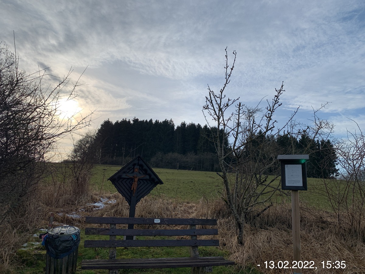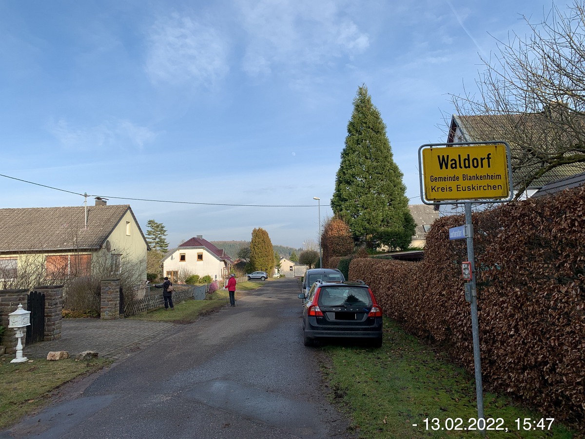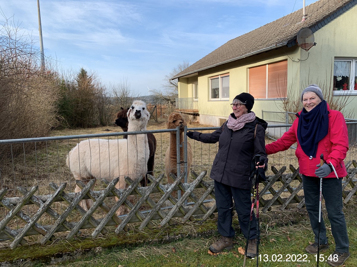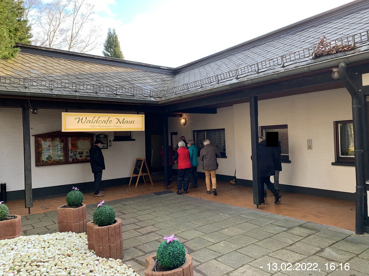 Mit den Autos vom Parkplatz P3 unterhalb der Weiherhalle über die Ahrstraße durch Ripsdorf nach Waldorf zum dortigen Bürgerhaus. Hier erwartete uns schon Robert mit weiteren Mitstreitern:innen. Sofort südlich auf unsere Wegstrecke Richtung Esch. Wetter gut, kühl, sogar etwas Sonnenschein. Auf der Höhe sehr windig. Also viel frische und gesunde EifelLuft. Wege der Jahreszeit entsprechend teilweise noch nass und matschig, ansonsten aber gut. Weitblicke u. a. auf Aremberg, Hohe Acht und Nürburg. Viele  Windräder  in der Ferne; müssen wohl noch mehr werden wenn wir unsere Energie-Probleme jetzt und in der Zukunft bewältigen wollen. Pause und Gruppenbilder an der neuen Wanderhütte. (laut Heinrich erbaut vom Verkehrsverein Oberes Kylltal)  Weiter auf unserem Rückweg vorbei am Wegekreuz, dem neuen LTE-Sendemast, der jetzt in Betrieb ist. In Waldorf  freundliche/s Alpackas/Lama, Kirche, Charly's Hütte (scheint momentan wohl geschlossen; wie einige berichten sind sie früher dort gerne eingekehrt). Wieder am Bürgerhaus angekommen mit den Autos nach Nonnenbach zum WaldCafe Maus.