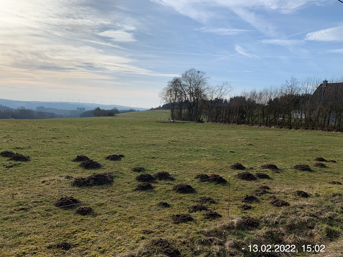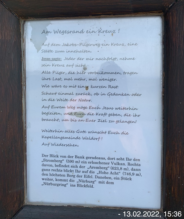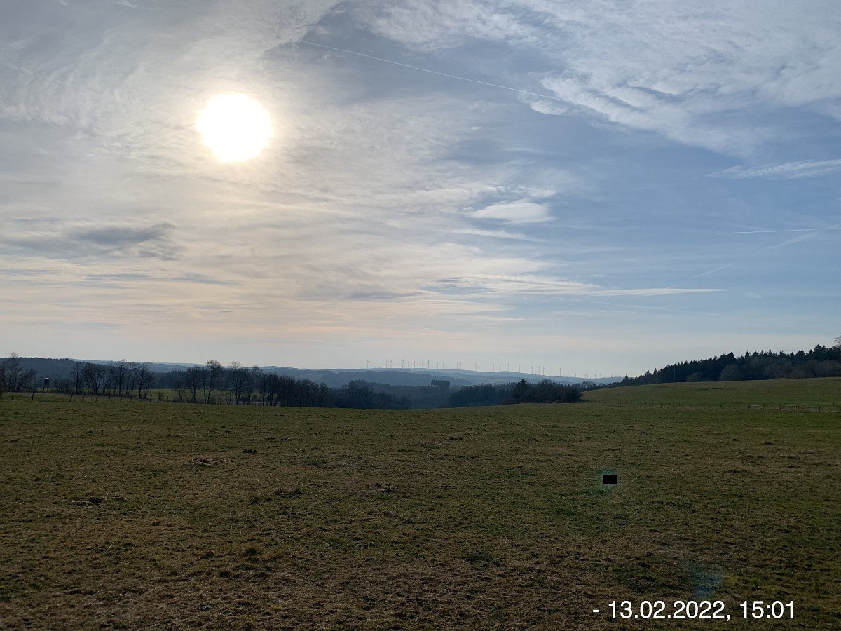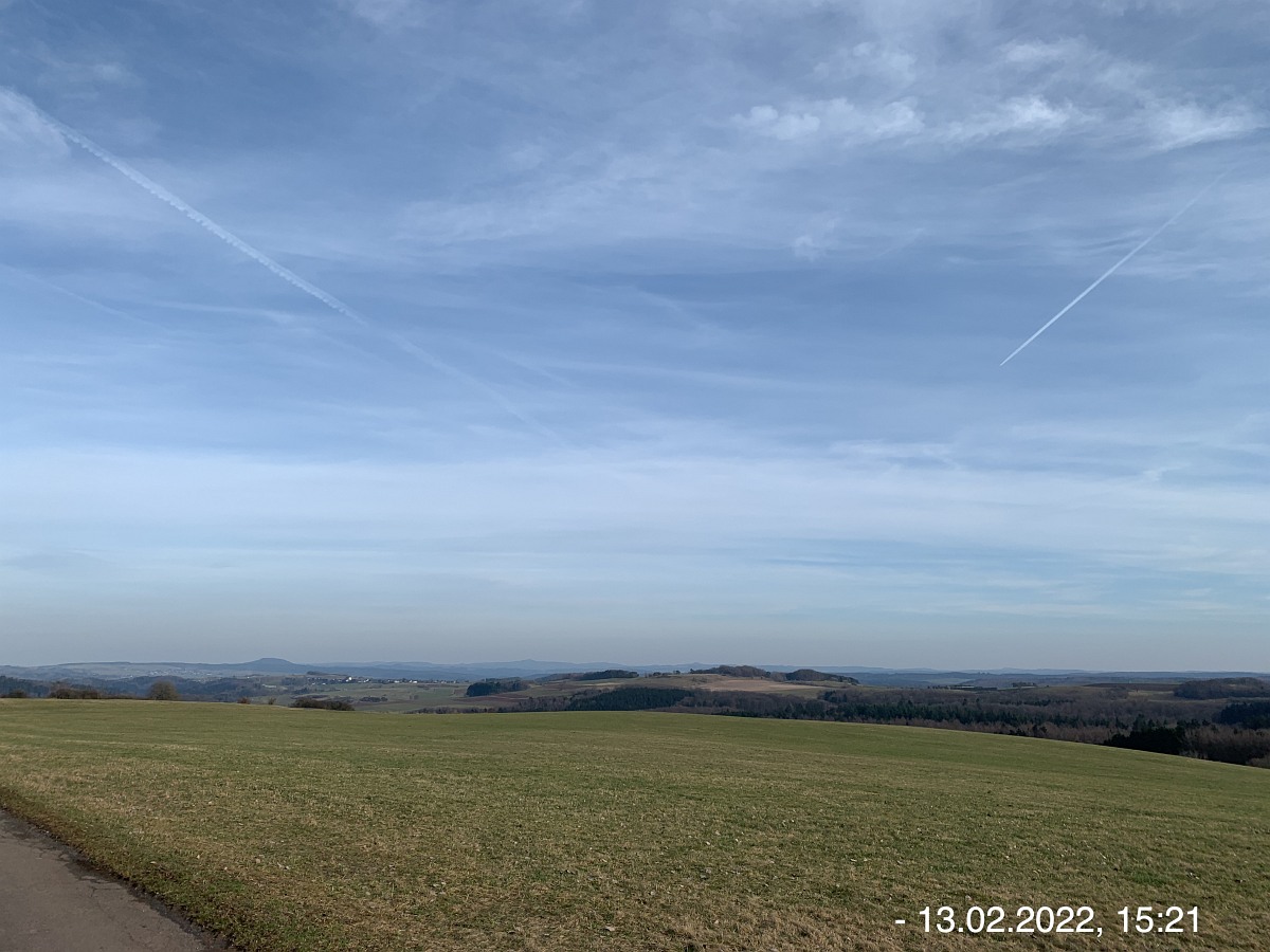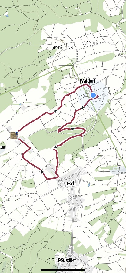 Mit den Autos vom Parkplatz P3 unterhalb der Weiherhalle über die Ahrstraße durch Ripsdorf nach Waldorf zum dortigen Bürgerhaus. Hier erwartete uns schon Robert mit weiteren Mitstreitern:innen. Sofort südlich auf unsere Wegstrecke Richtung Esch. Wetter gut, kühl, sogar etwas Sonnenschein. Auf der Höhe sehr windig. Also viel frische und gesunde EifelLuft. Wege der Jahreszeit entsprechend teilweise noch nass und matschig, ansonsten aber gut. Weitblicke u. a. auf Aremberg, Hohe Acht und Nürburg. Viele  Windräder  in der Ferne; müssen wohl noch mehr werden wenn wir unsere Energie-Probleme jetzt und in der Zukunft bewältigen wollen. Pause und Gruppenbilder an der neuen Wanderhütte. (laut Heinrich erbaut vom Verkehrsverein Oberes Kylltal)  Weiter auf unserem Rückweg vorbei am Wegekreuz, dem neuen LTE-Sendemast, der jetzt in Betrieb ist. In Waldorf  freundliche/s Alpackas/Lama, Kirche, Charly's Hütte (scheint momentan wohl geschlossen; wie einige berichten sind sie früher dort gerne eingekehrt). Wieder am Bürgerhaus angekommen mit den Autos nach Nonnenbach zum WaldCafe Maus.