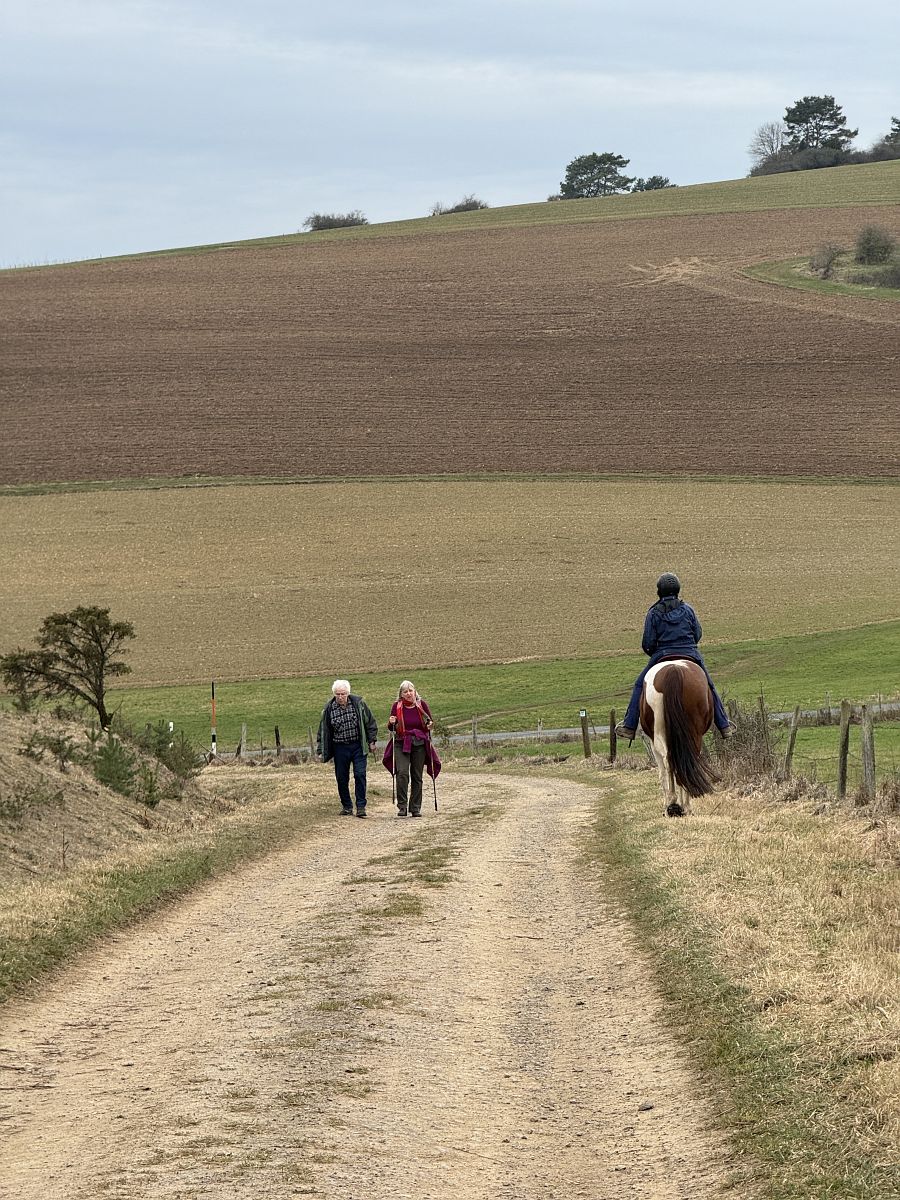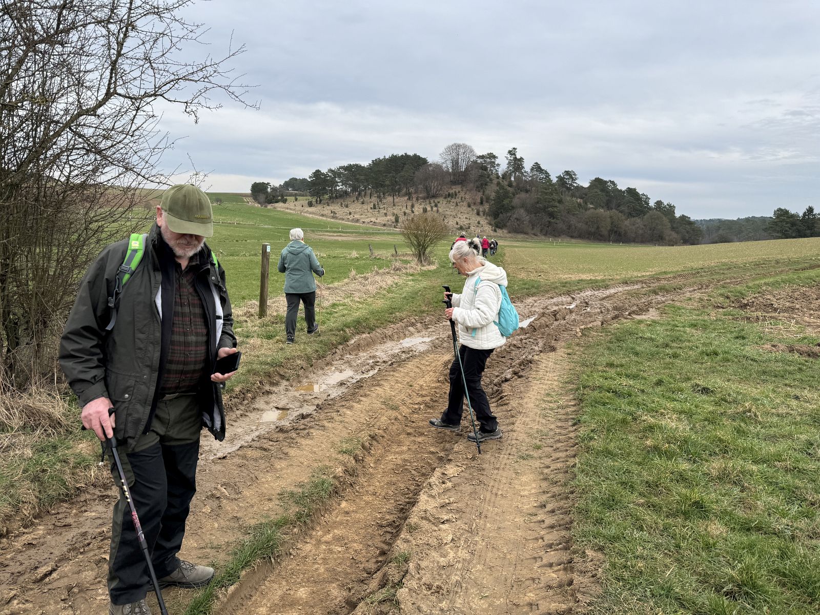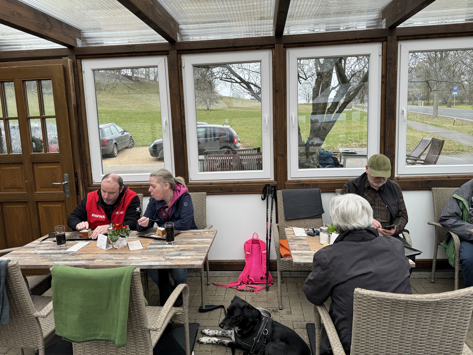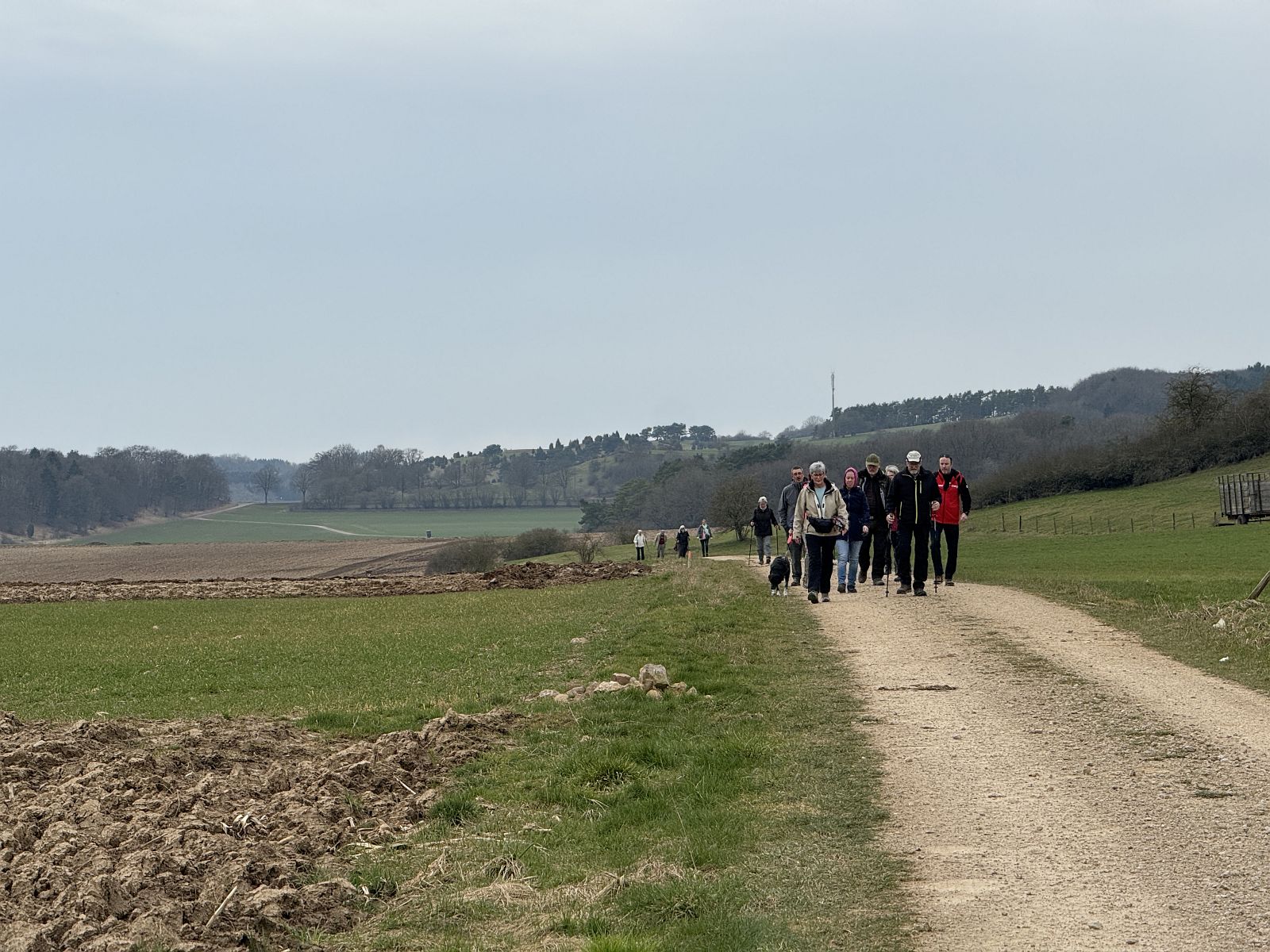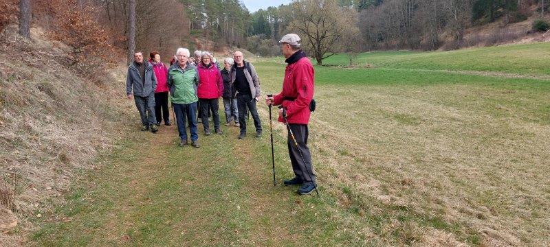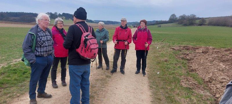 Ein super gelungener Fast-Frühlings-WanderStart 2024. Tolle Beteiligung von 22 Personen. Mir ist heute ein kleines Missgeschick passiert, so dass ich verspätet am WanderStart-Parkplatz am ehemaligen Steinbruch Höneberg ankam. Die anderen waren schon im Lampertstal entlang dem Lampertsbach Richtung Alendorf unterwegs. Nach Rücksprache mit Heinrich bin ich ihnen dann aus der entgegengesetzten Richtung halbwegs entgegengewandert, und o Wunder, wir haben uns auch gefunden. Unsere heutige Wanderstrecke war größtenteils die EifelSchleife "Wo Bäche schwinden". (Stichwort: Karst) Eine hügelige Landschaft bergauf und bergab, aber bis auf ein paar Steigungen und Abstiege leicht zu bewältigen, was auch alle ohne Probleme schafften. Die Natur noch nicht ganz frühlingshaft, aber Temperatur wanderfreundlich und die zumeist naturbelassenen Wanderwege bis auf ein paar ausgefahrene tiefe, mit Matsch gefüllte Fahrspuren, gut. Kein Niederschlag. Aber einige Frühlingsboten waren doch schon zu sehen: Gemeine Hasel, Seidelbast und auch schon ein paar Gänseblümchen. Vom Ausblick "Ripsdorf Büchelsberg" wieder mal Weitblicke auf "Aremberg - Hohe Acht und Nürburg". (Stichwort: Haus Arenberg). Gemütlicher Abschluss in Alendorf im Cafe Stübchen unterhalb der "Alten Kirche Alendorf" an der Kriegsgräberstätte.